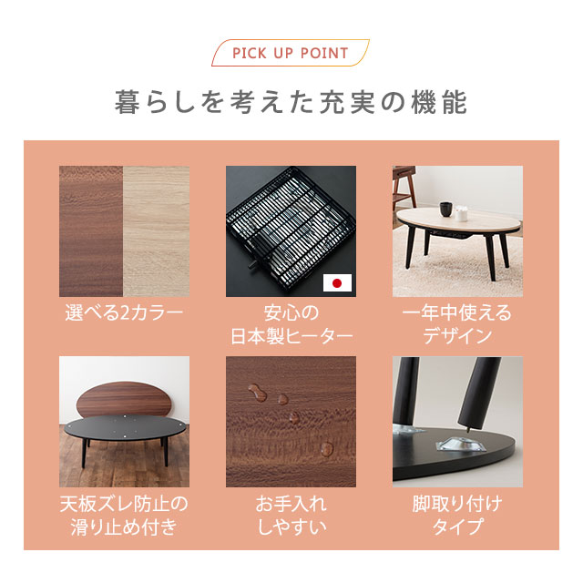 暮らしを考えた充実の機能 ・ウォルナット、ヴィンテージの2カラーから選べる ・安心の日本製ヒーター ・省エネモデルでコスパ◎ ・天板ズレ防止の滑り止め付き ・お手入れしやすい ・脚取り付けタイプ こたつの命、ヒーターは安心の日本製。