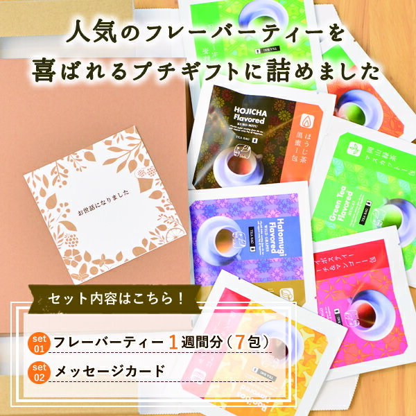 フレーバティー7包とメッセージカード1枚の 贈り物にぴったりの内容です。