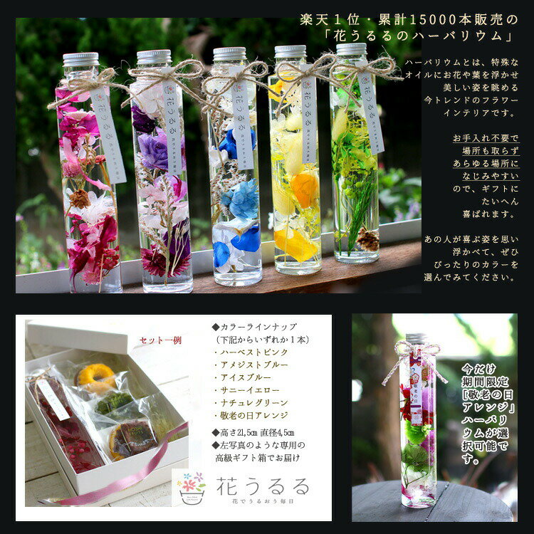 ハーバリウムだけ、お菓子だけではちょっと寂しいな、、と思われる方にぴったりの、お誕生日ギフトや御歳暮、結婚祝い、開店祝いなど、女性や男性、40代 50代 60代 70代の方まで幅広くご利用いただけるのギフトのハーバリウムで喜んでいただきませんか? ◆商品内容 ・ハーバリウムボトル(花のオイル漬け)1本とお菓子の詰め合わせ (※お菓子の内容や数量は2枚目の写真をご参照ください。